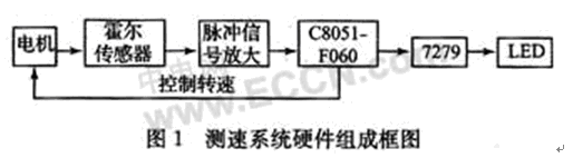 本系統采用單片機C8051F060作為主控制器,使用霍爾傳感器測量電機的轉速,通過7079最終在LED上顯示測試結果。此外,還可以根據需要調整控制電機的轉速,硬件組成由圖1所示。