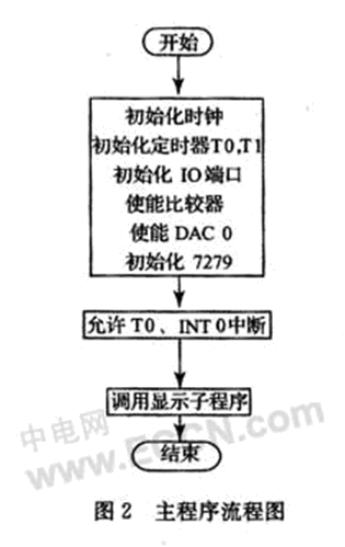 控制器C8051F060主要完成轉速脈沖的采集、16為定時計數器計數定時、運算比較,片內集成的12位DAC0控制轉速,并且通過7279顯示接口芯片實現數碼顯示等多項功能。系統采用外部晶振,系統時鐘SYSCLK等于18432000,T0定時1 ms,初始化時TH0=(-SYSCLK/1 000)》8;TL0=-SYSCLK/1 000。等待1 s到,輸出轉速脈沖個數N,計算電機轉速值。將1 s內的轉速值換算成1 min內的電機轉速值,并在LED上輸出測量結果。