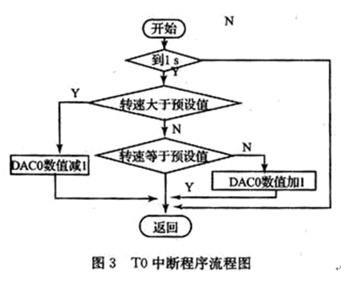 本系統采用C8051F060中的INT0中斷對轉速脈沖計數。定時器T1工作于外部事件計數方式對轉速脈沖計數;T0工作于定時器方式均工作于方式1。每到1 s讀一次計數值,此值即為脈沖信號的頻率,根據式(1)可計算出電機的轉速。由于直流電機的轉速與施加工于電機兩端的電壓大小有關,故將實際測得的轉速值與預設的轉速值比較,若大于預設的轉速值則減小DAC0的數值,若小于轉速預設的轉速值則增加DAC0的值調整電機的轉速,直到轉速值等于預設定的值,這樣就實現了對電機轉速的控制,主程序和T0中斷流程圖如圖2、3所示。