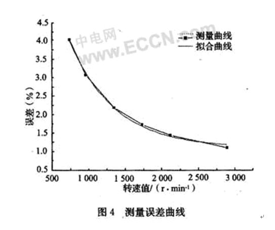 首先在軟件中給出轉速預設值,即給定常量speed的值,觀察速度穩定后七段數碼管的數值,比較實際測量的轉速值和預設轉速值,計算測量誤差,評價測量的準確性,測試結果如表1所示。根據實驗測試和誤差分析繪制了測量誤差曲線,如圖4所示。誤差分析表明,轉速測量誤差在5%以內,并且隨著轉速預設值的增加測量誤差愈小,呈指數形式下降,函數關系如式(3)所示。