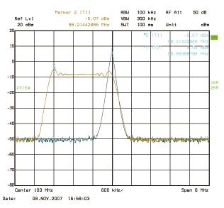 另一種可行解決方案是使用展頻振蕩器(Spread Spectrum Oscillator),來降低系統輻射出來的EMI電磁輻射干擾。圖4則顯示一個單頻信號的頻譜圖以及對該信號展頻后的頻譜圖。從圖中可知展頻后的頻率信號如何降低原來在接近100MHz的峰值。