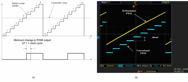 圖 3. 標準 PWM 方案圖,以及高分辨率PWM 與傳統PWM 的示波器圖比較