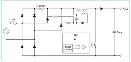 圖 3 顯示了為克服 NTC 中許多惱人問題的實施方案。這種實施方案就是既可選擇固定阻值的電阻,也可選擇 NTC 作為浪涌電阻。這里所闡述的浪涌電路具有兩只額外的硅控整流器 (SCR) 和一個來自 PFC 升壓電感小輔助繞組的非穩壓電壓源。