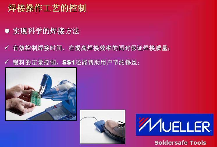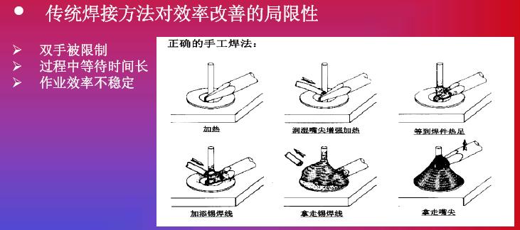 在發(fā)熱功率方面的提高,我們碰到另外一個問題。我們也可以看到951和937,還有新推出來機(jī)器,我們將發(fā)熱功率進(jìn)行對比。他們也花了很多研發(fā)精力來提高發(fā)熱功率,如果在提高發(fā)熱功率之后,確實(shí)能提高生產(chǎn)效率,但是它是不是可以被無限制提升呢?現(xiàn)在的機(jī)器比如到150瓦到160瓦,已經(jīng)上升了3倍,是否還會提高到4倍,這一個效率的提高導(dǎo)致整體效率的提高,我個人不是很贊同。其實(shí)這是比較系統(tǒng)性的解決方案,我們看到MUELLER是通過對工藝改進(jìn)達(dá)到更高的焊接效率。在談到這款機(jī)器之前,我們回顧一下傳統(tǒng)焊接方法作業(yè)的特點(diǎn),我們的圖從左到右看,整個工藝從加熱到預(yù)熱,再繼續(xù)加熱,第四步是添加焊心,然后取走焊嘴,這是非常傳統(tǒng)的焊接工藝,反過來看,我們看到整個焊接過程中,雙手是被限制的。從第二張圖開始,都是靠手去拿,關(guān)鍵是控制在雙手被占用。過程等待時間會很長,我們可以看到實(shí)際作業(yè)過程中下面三步是真正起到作用,前面預(yù)熱當(dāng)然是準(zhǔn)備工作,但是在這個工作中,我們雙手等待的時間會非常長。第三個,作業(yè)效率不是特別穩(wěn)定,因為我們送錫的時候,以及拿走錫絲過程中依賴員工本身的技巧和技術(shù)。