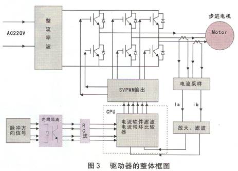 這種傳輸方式以模擬電壓的幅值代表采樣電流或者電壓的大小,其主要用來采樣a,b兩相電流及母線電壓檢測,實現電機電流控制以及過壓、欠壓、過流保護。驅動器通過采樣電阻檢測步進電機繞組的實際電流,與設定電流相比較后經過滯環比較器調節器,調節器輸出信號經過滯環比較器調節器,調節器輸出信號由20kHz頻率的三角波輸出,形成空間矢量脈寬調制信號(SVPWM),通過功率驅動接口電路來控制大功率半導體器件的導通與關斷,使步進電機的繞組實際電流跟蹤給定參考信號,按給定的正弦規律變化。
