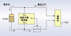 過度充電保護IC的原理為:當(dāng)外部充電器對鋰電池充電時,為防止因溫度上升所導(dǎo)致的內(nèi)壓上升,需終止充電狀態(tài)。此時,保護IC需檢測電池電壓,當(dāng)?shù)竭_4.25V時(假設(shè)電池過充點為4.25V)即激活過度充電保護,將功率MOSFET由開轉(zhuǎn)為切斷,進而截止充電。