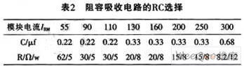 模塊過壓保護一般也可采用阻容吸收法。對于持續(xù)時間較短,能量不大的過電壓,一般可在模塊兩端并聯(lián)阻容吸收電路,用吸收電容把過電壓的電磁能量變成靜電能量存貯起來。而用吸收電阻不但可以防止電路振蕩,還可限制晶閘管導(dǎo)通時電容放電所產(chǎn)生的開通損耗和di/dt值。并聯(lián)在晶閘管開關(guān)模塊的RC值可參考表2。