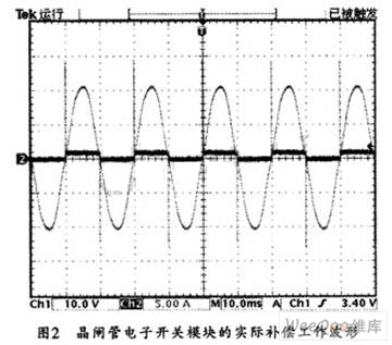 在無功補償實際應(yīng)用中,可將晶閘管電子開關(guān)模塊用在TSC低壓無功補償以替代接觸器,這樣,就可以在開關(guān)電壓過零時投入補償電容量,從而避免了沖擊電流的產(chǎn)生和瞬間電網(wǎng)電壓的波動。圖2所示是其工作波形圖。