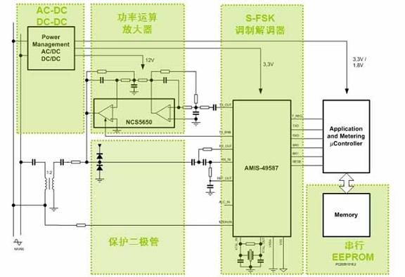 此外,AMIS-49587采用S-FSK調(diào)制技術(shù),結(jié)合高分辨率的濾波算法,配以自動可信值/中繼器(repeater)功能,提供基于長距離電力線的高可靠性數(shù)據(jù)通信。通信誤差比其它可選及現(xiàn)有方案更低。這器件藉板載低抖動鎖相環(huán)(PLL)與交流主電源(mains)信號同步。由于包含16位分辨率的模擬前端,使器件具有極優(yōu)的噪聲免疫性和極高的接收靈敏度。