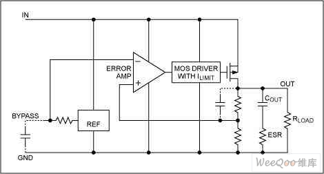 低壓差線性穩壓器(LDO)的結構主要包括啟動電路、恒流源偏置單元、使能電路、調整元件、基準源、誤差放大器、反饋電阻網絡,保護電路等,基本工作原理是這樣的:系統加電,如果使能腳處于高電平時,電路開始啟動,恒流源電路給整個電路提供偏置,基準源電壓快速建立,輸出隨著輸入不斷上升,當輸出即將達到規定值時,由反饋網絡得到的輸出反饋電壓也接近于基準電壓值,此時誤差放大器將輸出反饋電壓和基準電壓之間的誤差小信號進行放大,再經調整管放大到輸出,從而形成負反饋,保證了輸出電壓穩定在規定值上;同理如果輸入電壓變化或輸出電流變化,這個閉環回路將使輸出電壓保持不變,即:
