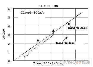 在測試壓差(Dropout)時不同的廠家有不同的標準。德州儀器(TI)電壓差定義為輸出電壓較其標稱值跌落2%時的輸入、輸出電壓的差值.其它的如,美信(Maxim),圣邦微電子(SGMC)電壓差定義為輸出電壓較其標稱值小于100mV時的輸入、輸出電壓的差值.如圖為圣邦微電子的SGM2007負載為300mA時輸入電壓和輸出電壓的曲線。