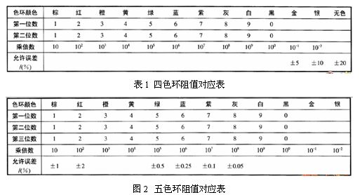 現(xiàn)在常用的固定電阻都用色環(huán)法來(lái)表示它的標(biāo)稱阻值和誤差。色環(huán)法就是用顏色表示元件的標(biāo)稱阻值和誤差,并直接標(biāo)志在產(chǎn)品上的一種方法。常見(jiàn)的色環(huán)電阻有四環(huán)和五環(huán)電阻兩種(其中五環(huán)電阻屬于精密電阻)。一般由四道色環(huán)或五道色環(huán)來(lái)表示其標(biāo)稱阻值和誤差,各種顏色代表不同的數(shù)值,色環(huán)顏色所代表的數(shù)字或意義如表1和表2所示。