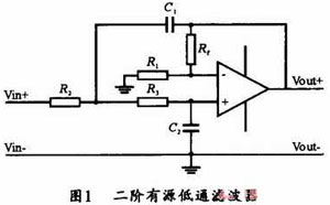 有源濾波器的設(shè)計原理圖如圖1所示,圖中采用了一個運算放大器、四個電阻和兩個電容來構(gòu)成有適當阻尼的二階有源低通濾波器。