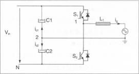 電氣連接為漏電流提供了流通路徑,是高效率的非隔離光伏并網(wǎng)逆變器應(yīng)用的最大障礙。漏電流問題會產(chǎn)生寄生電容150nF/kWp,引起開關(guān)頻率共模電壓源。目前大多采用電路結(jié)構(gòu)SPWM調(diào)制的策略。
