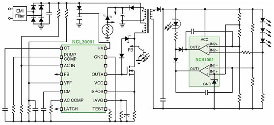 NCL30001是一種單段拓撲結(jié)構(gòu)LED驅(qū)動方案,其靈活的特性非常適合應(yīng)用于新的LED照明產(chǎn)品,其他規(guī)格特性還包括高壓啟動電路、電壓前饋以改善環(huán)路響應(yīng)、輸入欠壓檢測、內(nèi)部過載定時器、閂鎖輸入,以及減少輸入線路諧波的高精度乘法器。這種方案采用連續(xù)導(dǎo)電模式(CCM)工作,集成了PFC和隔離型DC-DC轉(zhuǎn)換電路,并提供恒定電流來直接驅(qū)動LED,相當(dāng)于將AC-DC轉(zhuǎn)換與LED驅(qū)動兩部分電路整合在一起,均位于照明燈具內(nèi),省去了LED光條中集成的線性或DC-DC轉(zhuǎn)換器。這種整體式方案的電源轉(zhuǎn)換段更少,減少元器件使用數(shù)量(如光學(xué)元件、LED、電子元件及印制電路板等),降低系統(tǒng)成本,并支持更高的LED電源總體能效。當(dāng)然,這種方案的功率密度更高,可能并不適合所有區(qū)域照明應(yīng)用,其光學(xué)圖案可能更適合較低功率的LED,典型應(yīng)用包括LED街燈、外墻燈、洗墻燈及電冰箱箱體照明等。