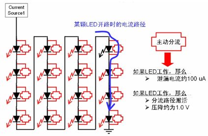 區(qū)域照明應(yīng)用中通常會采用多串LED,雖然LED本身可靠性高,但若LED串中的某個LED開路,那么整串LED就可能關(guān)閉,而街道照明等應(yīng)用中必須避免這種狀況,從而降低后期維護成本。為了增強LED串的可靠性,這種安森美半導(dǎo)體推出了NUD4700 LED電流旁路保護器。NUD4700器件是一款分流器件,當(dāng)LED串中某個LED開路時,就會提供電流旁路,確保整串LED不會關(guān)閉;而且恰當(dāng)處理散熱的話,還可支持大于1 A的大電流,其工作原理如圖8所示。