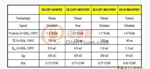 表1顯示了四個(gè)擁有相同尺寸的IGBT的參數(shù)值。前三個(gè)IGBT采用同樣的平面式技術(shù),但使用不同的壽命復(fù)合控制計(jì)量。從表中可見,標(biāo)準(zhǔn)速度的IGBT具有最低Vce(on) ,但與快速和超速平面式IGBT相比,標(biāo)準(zhǔn)速度的IGBT下降時(shí)間最慢。第四個(gè)IGBT是經(jīng)優(yōu)化的槽柵IGBT,能夠?yàn)樘柲苣孀兤鬟@類高頻率切換應(yīng)用提供低導(dǎo)通和開關(guān)損耗。請(qǐng)注意,槽柵IGBT的Vce(on) 和總切換損耗 (Ets) 比超速平面式IGBT低。