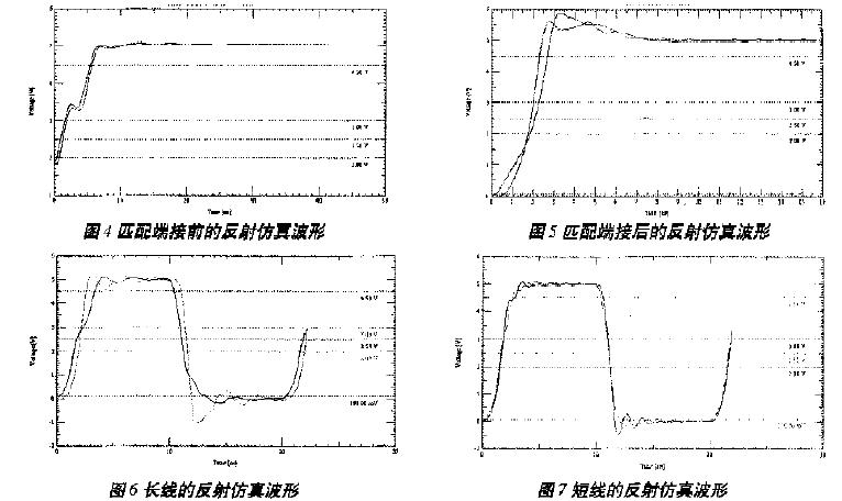 用頻率為50MHz,占空比為0.5的Pulse信號作觸發,圖4和圖5分別為利用Signoise工具仿真得到的匹配端接前、后的仿真波形。從圖中可以看出,端接前,波形在上升沿有畸變發生,容易引起誤操作。匹配端接有效地消除了信號的畸變,單調性很好,而且在上升沿拉升了原信號,提前進入電平切換,增加了信號的穩態時間,信號的上升沿也比較平穩。雖然在高電平的維持階段有上過沖,但對信號確認沒有影響,信號質量比較理想。另外,信號傳輸線長度對反射也有一定的影響。仿真發現,傳輸線較長時,出現了預示的反射現象,如圖6所示;而傳輸線較短時,仿真波形和分析結果吻合得很好,如圖7所示。表1為上述兩種情況下的波形仿真參數。所以,布線長度不同,其處理方法也應不同。一般來說,走線長度小于2英寸,以集總參數的LC電路來處理;大于8英寸,則以分布參數的傳輸線電路來對待。