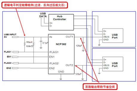 NCP382則是一款功率分配開關(guān),其設(shè)計(jì)針對很可能會遇到大的電容性負(fù)載或短路的應(yīng)用。實(shí)際上,越來越多便攜電子設(shè)備采用USB供電,但需要保護(hù)本地USB電源夠用受外部Vbus故障影響。NCP382能夠通過在輸出負(fù)載超過限流閾值或出現(xiàn)短路時(shí)切換至恒流模式,將輸出電流限制在期望的電平(0.5 A、1 A或1.5 A),從而提供過流保護(hù)。NCP381接收2.5 V至5.5 V的單路輸入,提供2路輸出。圖6是NCP382的典型應(yīng)用電路圖。