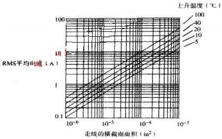 圖2描述了最大的功率輸送能力和溫度上升的關系。在圖2中,水平軸顯示的是橫截面面積,單位為IN的2次方,縱軸顯示的是該線在給定升溫值時的允許電流。