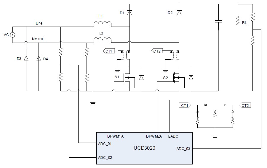 在其他無橋PFC拓撲結構中,圖1是一個已被業界廣泛采用的無橋PFC實例。它具有兩個DC/DC升壓電路,一個由L1、D1和S1組成,另一個則由L2、D2和S2組成。D3和D4為慢恢復二極管。通過參考內部電源地,分別檢測線路(Line)和中性點(Neutral)電壓,測量得到輸入AC電壓。通過對比檢測到的線路和中性點信號,固件便可知道它是一個正半周,還是一個負半周。在一個正半周內,第一個DC/DC升壓電路(L1-S1-D1)有效,并且升壓電流通過二極管D4回到AC中性點;在一個負半周內,第二個DC/DC升壓電路(L2-S2-D2)有效,并且升壓電流二極管通過D3回到AC線。像UCD3020這樣的數字控制器用于控制這種無橋PFC。
