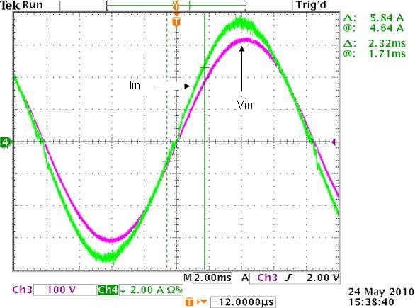圖5:低壓線路的VIN和IIN波形(VIN=110V,負載=1100W,THD=2.23%,PF=0.998)