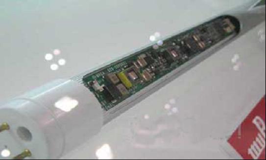 參考展示Clear Sodick生產的直管型LED照明產品,管內內置了電源電路,相當于40W熒光燈的產品的耗電量為19W,LED元件數量為204個。