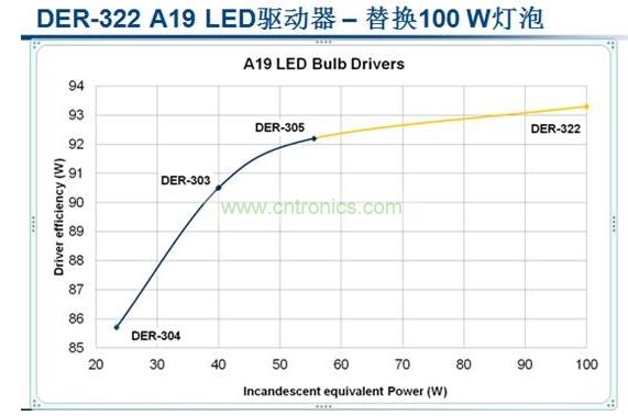 現在100 W白熾燈替換LED一般都需要采用PAR38,采用A19規格的LED尚未出現。現在PI已經推出業界首個針對100 W A19白熾燈泡替換應用的LED驅動器設計DER-322,該驅動器可為100 W A19白熾燈泡的LED替換燈提供所需的功率,這是業界首個此類設計。PI大功率LED驅動設計的推出,對于替換100W白熾燈大功率LED快速進入市場有很大的推動的作用。