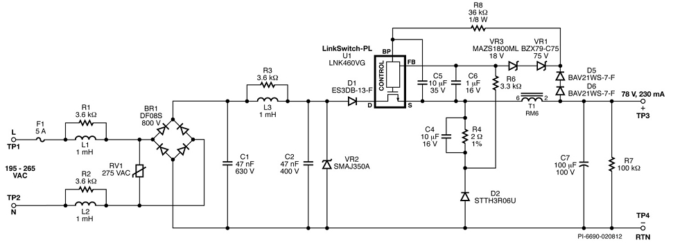 注意:本設計利用DER-305 PCB板制作,最大限度地利用了LNK460VG器件散熱器的面積。