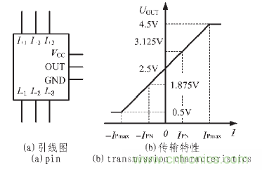 常用的TBC-DS 系列閉環(huán)霍爾電流傳感器的引線框圖和傳輸特性如圖5 所示[6]。圖5(a)所示的霍爾電流傳感器引線中,I+1~3和I-1~3是被測電流的串入繞組引腳, 其中,I+1和I-1是一個被測電流繞組的引腳,I+2和I-2、I+3和I-3也分別各是一個被測電流繞組的引腳。當(dāng)3 個被測電流繞組并聯(lián)時,霍爾電流傳感器的額定測量電流為IPN1; 若將兩個繞組并聯(lián)再與一個繞組串聯(lián)時,霍爾電流傳感器的額定測量電流為IPN2;若將3 個繞組相互串聯(lián)時,霍爾電流傳感器的額定測量電流為IPN3。3 個額定測量電流間的關(guān)系為:IPN1=2 IPN2=3 IPN3??梢姡ㄟ^3 組被測電流繞組的不同接法,可以改變霍爾電流傳感器的額定測量電流值,擴(kuò)展測量區(qū)間。VCC為電源引腳,電源電壓通常為5 V;GND 是電源和傳感器輸出電壓的地;OUT 是傳感器電壓輸出引腳。由5(b)所示的霍爾電流傳感器傳輸特性可見,當(dāng)被測電流為0 時,其輸出電壓UOUT =2.5 V;當(dāng)被測電流不為0 且方向為從I+至I-時,輸出電壓UOUT>2.5 V,當(dāng)被測電流不為0 且方向為從I-至I+時,輸出電壓UOUT<2.5 V。IPN和-IPN是霍爾傳感器的正負(fù)額定電流, 當(dāng)被檢測電流達(dá)到額定電流時,根據(jù)電流方向的不同,輸出電壓UOUT 的值分別為3.125 V 或1.875 V, 即相對于2.5 V 的中心值有±0.625 V的偏移。當(dāng)被檢測電流值絕對值大于IPN 時,霍爾傳感器仍可輸出與被檢測電流成線性關(guān)系的電壓值,直至被檢測電流達(dá)到霍爾傳感器的最大檢測電流IPmax。通常,IPmax>3 IPN。