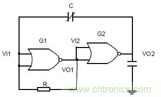 振蕩電路的作用是將電容的變化量轉(zhuǎn)化為頻率可變的方波。由圖3 可知,這是一個(gè)非對(duì)稱多諧振蕩器。或非門(mén)G1 工作在電壓傳輸特性的轉(zhuǎn)折區(qū),把它的輸出電壓直接連接到或非門(mén)G2 的輸入端。G2即可得到一個(gè)介于高低電平之間的靜態(tài)偏置電壓,從而使G2 的靜態(tài)工作點(diǎn)也處于電壓傳輸特性轉(zhuǎn)折區(qū)上。反饋環(huán)路中電容使電路在兩個(gè)暫穩(wěn)態(tài)之間往復(fù)振蕩。