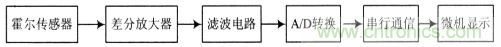 系統(tǒng)可以分為3個(gè)部分。第一部分是信號(hào)源,由霍爾傳感器產(chǎn)生電壓信號(hào),信號(hào)通過差分放大,濾波得到較清晰的信號(hào);第二部分是信號(hào)經(jīng)過A/D轉(zhuǎn)換送入單片機(jī)進(jìn)行處理,再通過串行通信送入PC機(jī)處理得到結(jié)果;第三部分是數(shù)據(jù)的顯示,這部分是通過VB的繪圖程序來完成,顯示結(jié)果以v-x關(guān)系圖來顯示。系統(tǒng)總流程如圖1所示。