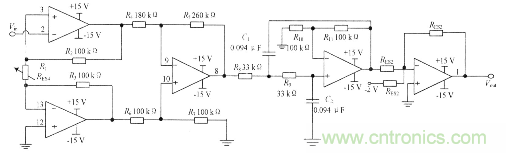 放大處理后的電壓信號(hào),雖然在幅值上達(dá)到了可以處理的范圍,但模/數(shù)電壓轉(zhuǎn)換的范圍是0~5 V,而傳感器輸出的電壓存在負(fù)值,為了使電壓匹配,信號(hào)電壓在接人模/數(shù)轉(zhuǎn)換器前可以加一級(jí)加法電路,將電壓信號(hào)全部轉(zhuǎn)換為正值。放大電路、濾波電路和加法電路均使用LM324實(shí)現(xiàn),硬件電路如圖4所示。