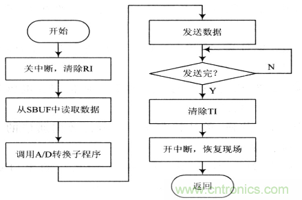 由于單片機(jī)多應(yīng)用于實(shí)時(shí)性較強(qiáng)的控制場合,為了盡量少占用CPU的時(shí)間,充分發(fā)揮CPU的功能。該系統(tǒng)在單片機(jī)程序設(shè)計(jì)中采用中斷方式與PC機(jī)進(jìn)行通信。主程序只進(jìn)行串行通信、數(shù)碼管實(shí)時(shí)顯示、模/數(shù)轉(zhuǎn)換結(jié)果的初始化和循環(huán)等待串行中斷工作,當(dāng)接收到PC機(jī)發(fā)來的信號(hào)時(shí),就轉(zhuǎn)人中斷服務(wù)程序,進(jìn)行A/D轉(zhuǎn)換,并向Pc機(jī)發(fā)送數(shù)據(jù)。中斷服務(wù)子程序流程圖如圖6所示。