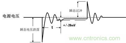 我們通常稱之為電源的負載瞬態恢復時間,或者瞬態響應時間。它表征的是,當負載電流發生突然變化的時候,電源電壓恢復到設定范圍內所需要的時間。如圖2所示: