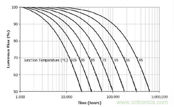 如果環境溫度是105℃,那么還至少要加上20℃才是結溫,所以結溫就大約是125℃。在這個曲線上已經查不到了,只能大致地估算其壽命只有4,000小時。這是絕對不能接受的!也就是說,LED泡殼里的環境溫度必須大大低于105℃!