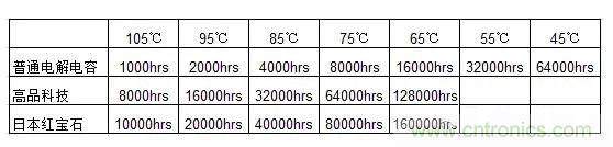 3、各種壽命的電解電容在45℃的環境溫度下的實際壽命
