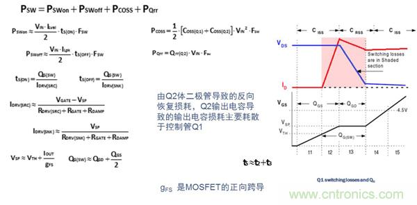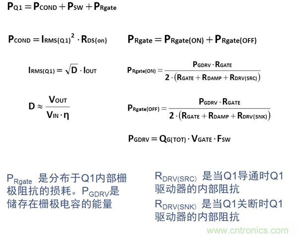 對于高頻應用(>MHz),控制管Q1的選用應針對降低開關(guān)損耗進行優(yōu)化。Q1損耗的計算公式如下: