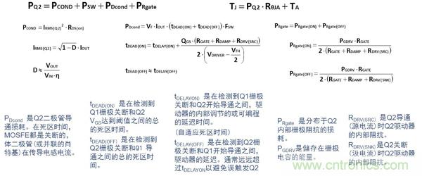Q1工作在硬開關(guān)條件下,在小占空比或高頻(> MHz)時以開關(guān)損耗為主,開關(guān)性能受同步管Q2影響:快速di/dt可導致反向恢復損耗增加,快速dv/dt有可能引起Q2誤導通, 造成Q1、Q2直通現(xiàn)象,導致額外的損耗。另外,值得注意的是,由Q2體二極管導致的反向恢復損耗、 Q2輸出電容導致的輸出電容損耗主要耗散于控制管Q1上 [Ref. 1,2]。因此,在計算Q1的開關(guān)損耗和溫度時必須綜合考慮到Q2的影響。另外,Q1的導通阻抗隨結(jié)溫上升而上升。結(jié)溫越高,導通阻抗越高,導通損耗就越高, 使得結(jié)溫進一步上升。因此,對Q1的導通損耗必須循環(huán)反復計算,直到管子的溫度計算結(jié)果穩(wěn)定下來。