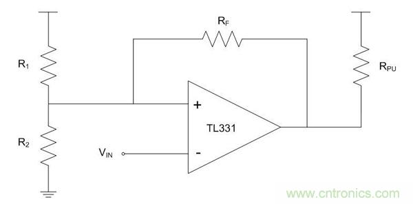 在這種配置中,當(dāng)輸入信號低時(shí),輸出拉低,導(dǎo)致非反相節(jié)點(diǎn)的電壓降到更低。一旦輸入信號足夠高,以拉動非反相節(jié)點(diǎn)高于參考電壓,輸出拉高,從而將非反相節(jié)點(diǎn)拉得更高。