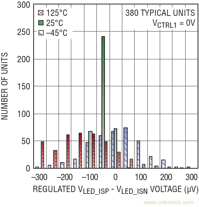 圖 1:VCTRL = 0V 時,LT3744 中的 LED 電流調節放大器之典型失調電壓為 ±300µV
