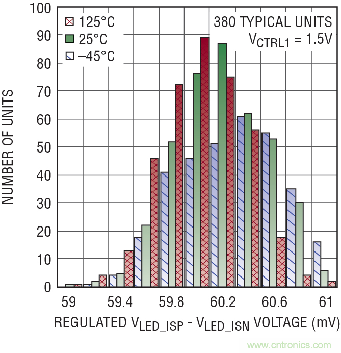 圖 1 顯示了當模擬控制輸入為 0V 時,隨溫度變化 LT3744 失調電壓的生產一致性,在這里,典型器件數量為 380 個。憑借誤差放大器的低失調,控制環路在 1/20 標度模擬調光時,能夠實現 ±10% 的典型準確度。圖 2 顯示了當控制輸入等于 1.5V 時,穩定電壓在多個 LED 電流檢測引腳上的分布。滿標度范圍的準確度好于 ±3%,這相當于在 60mV 滿標度調節電壓時準確度為 ±1.8mV。