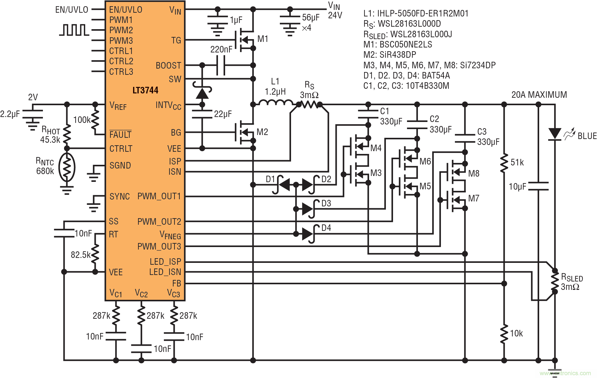 圖 14:并聯負輸出應用向連接到系統外殼的公共陽極 LED 提供 120W 功率。
