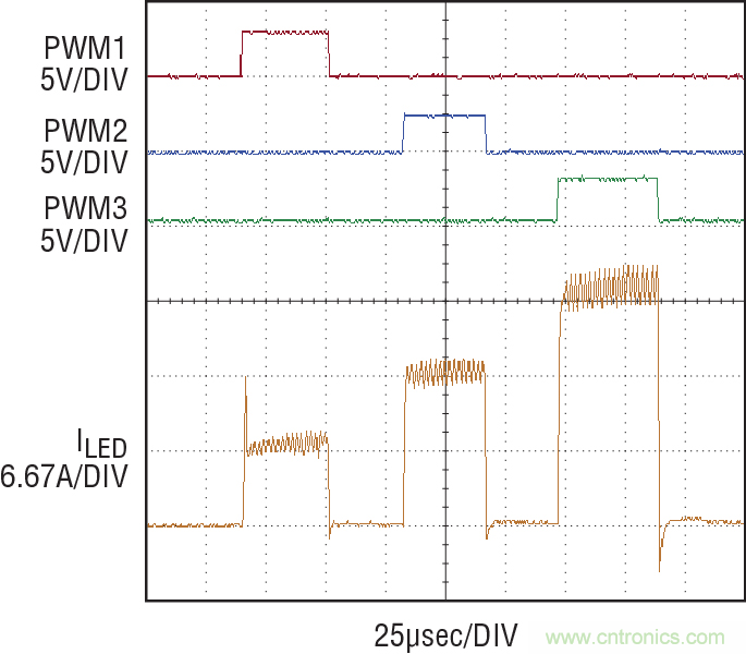圖 12:在進行 PWM 調光時,LT3744 的并聯驅動器之間實現了出色的 LED 電流均分。