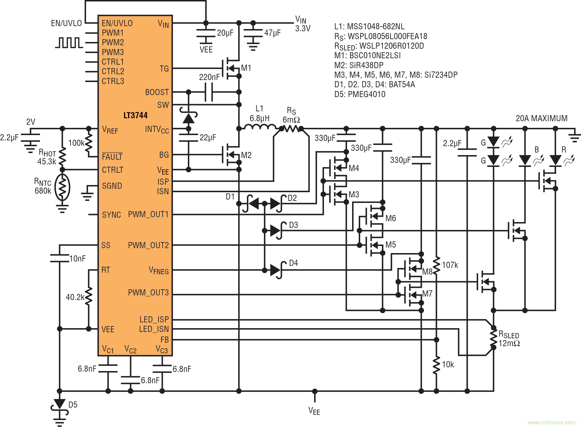 每個 LED 都可以順序接通,相互之間有一定的時間延遲,或者按照提供給 PWM 數字輸入的任何模式接通。此外,憑借 3 個獨立的模擬控制輸入,每個 LED 都能夠以不同的穩定電流運行。當 LT3744 配置為負輸出降壓-升壓型轉換器時,單節鋰離子電池僅用單個控制器就可以驅動 3 個獨立的 LED 串。圖 7 顯示了一個專門為 RGB 微型投影儀設計的 3.3V/5A 負輸出、3 色、降壓-升壓型 LED 驅動器。