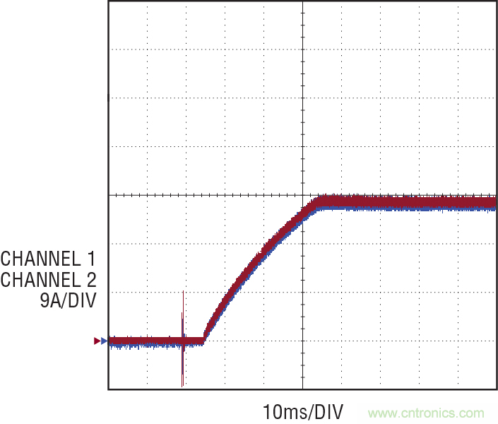 圖 8 顯示了一款 324W 轉換器,由兩個ADI DC2339A 演示電路板并聯組成。在這款設計中,每個并聯的控制器都產生 27A 電流,總共產生 54A 電流,電壓為 6V。通過將相應的補償輸出連接到一起,兩個控制器協調一致地運行,以提供平滑、良好的啟動和準確的 DC 調節。