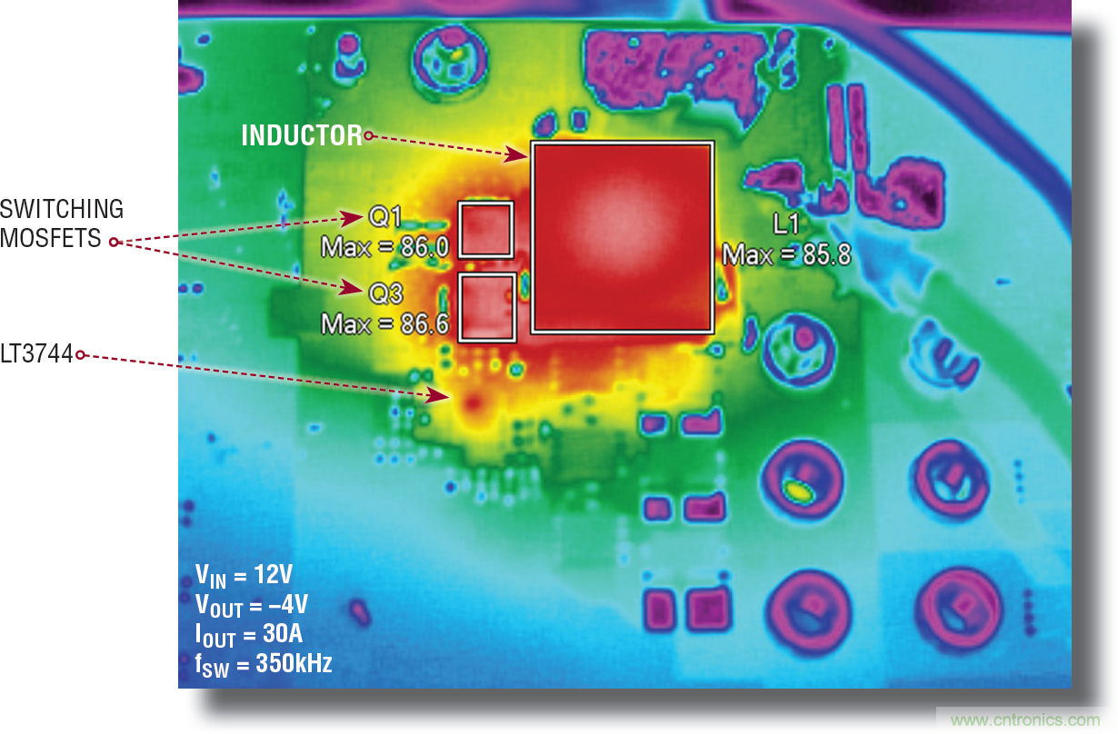 圖 15 顯示,向并聯負輸出降壓-升壓型應用中的 LED 提供 30A 電流時,組件溫度的上升情況。