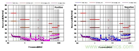圖4顯示了增加CM和DM濾波器后的噪聲特性。 與圖3相比,CM濾波器的增加降低了近20dBμV/ m的CM噪聲。 并且EMI性能也通過了CISPR25 C5標準。