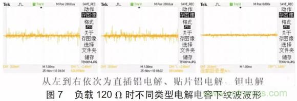 圖6 所示為負載是300 Ω 時不同類型電解電容下所測量到的紋波波形,可以明顯看出使用貼片鋁電解紋波最小,使用普通鋁電解紋波較大且紋波具有毛刺,使用貼片鉭電解紋波有所減小且毛刺也有很大程度的改善。