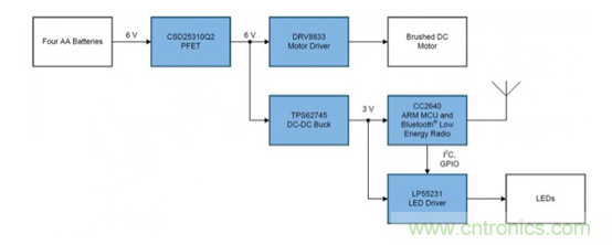 電機驅動器:驅動電流、電源電壓范圍、負載電機類型和安全關閉功能都是選擇電機驅動器時的因素。DRV8833可以驅動多種類型的電機和感性負載,峰值電流為2A,電源電壓范圍為2.7V至10.8V,非常適合使用四節AA電池。標稱驅動電壓電池的電壓是5V。